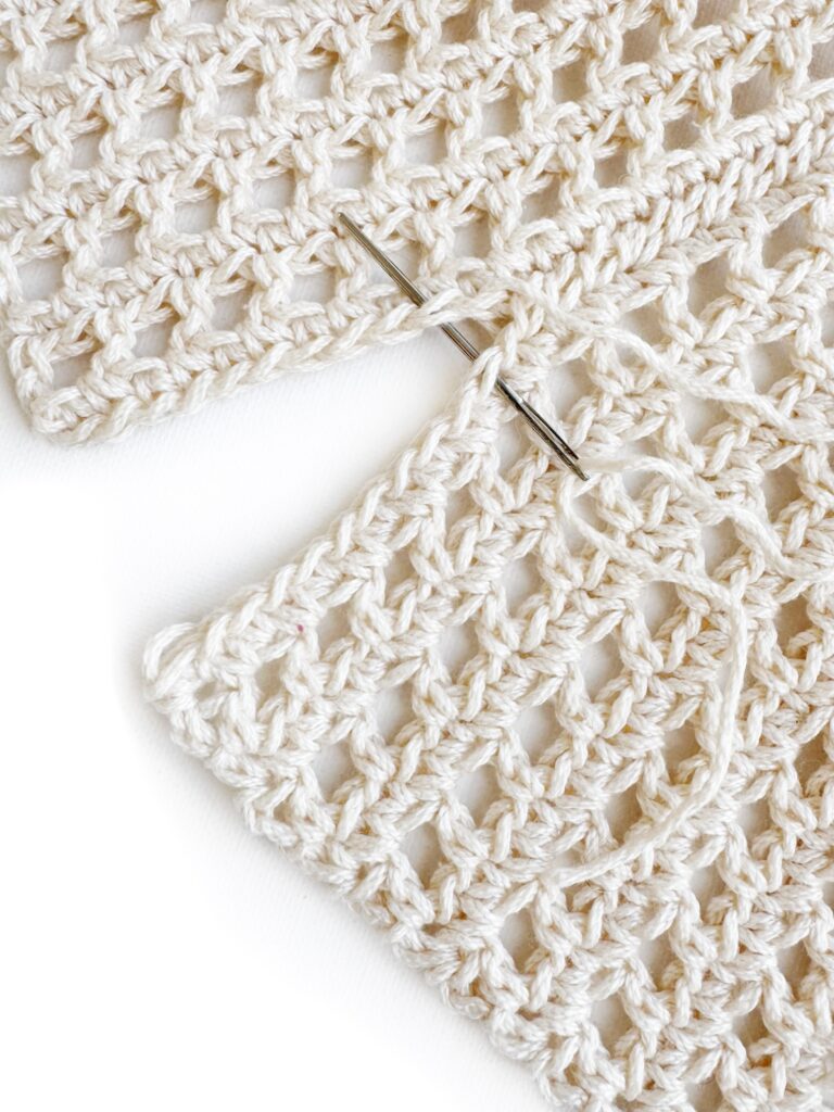 Using your darning needle and a strand of yarn, whip stitch front and back panels together joining at shoulders. Make sure ‘GOOD SIDES’ (single crochet sides) are both facing outward.