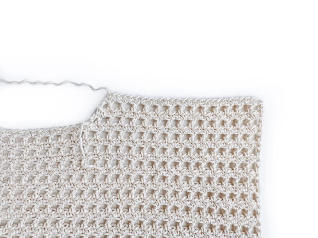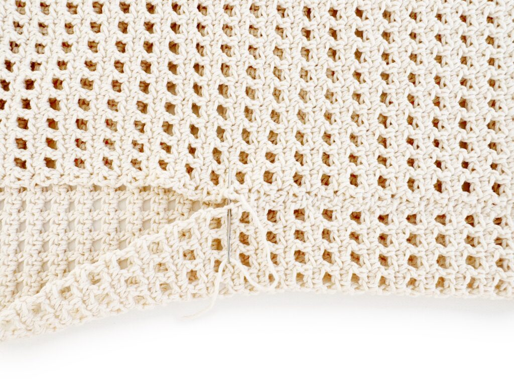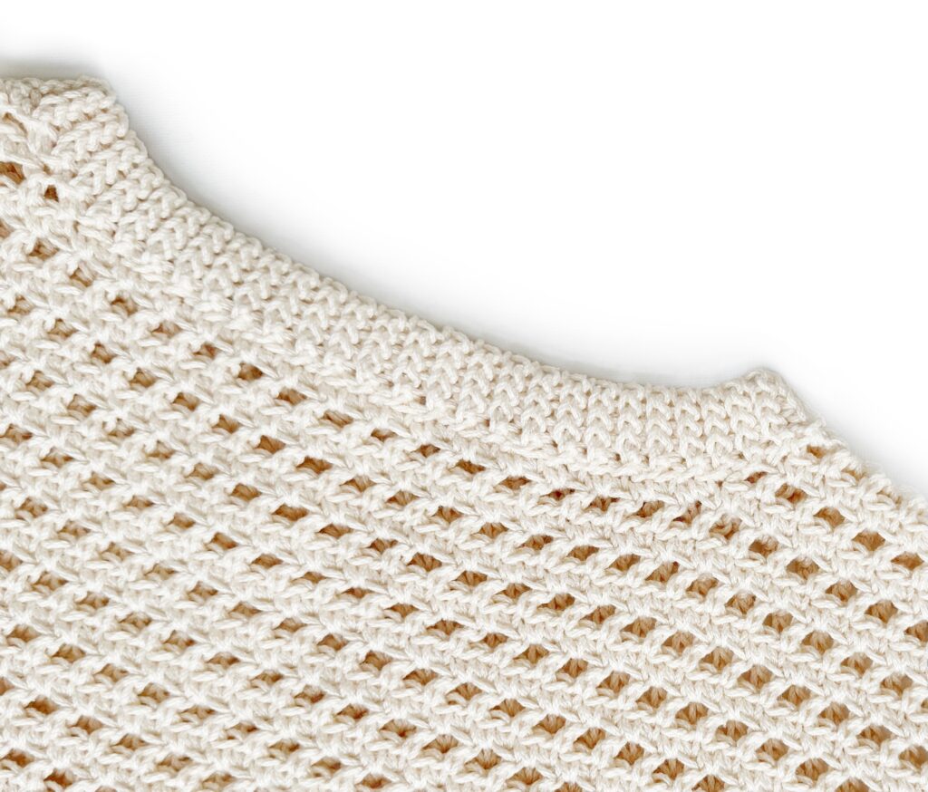 • Top is created with two identical front & back panels that are whip stitched together (once complete, trim is crocheted around openings)